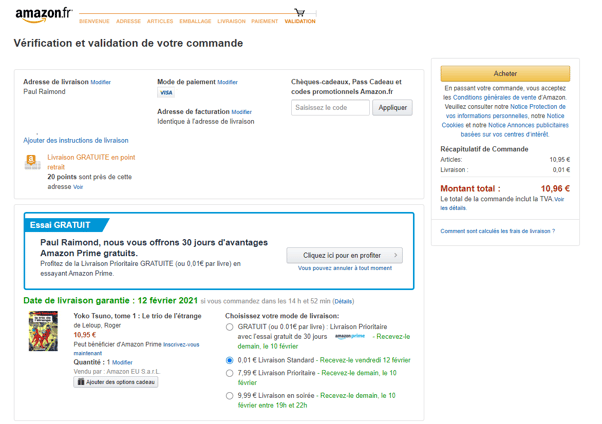 Sur cette dernière page, toutes vos informations sont présentées ainsi que les différentes options de livraison. En un coup d'œil, vous avez accès à la confirmation des pages précédentes. Il ne vous reste plus qu’à cliquer sur acheter et le tour est joué !