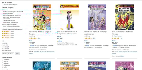 J’ai dans cet exemple tapé Yoko Tsuno, une série de bandes dessinées belge. Le site me propose ainsi clairement différents albums avec une multitude d'options à cocher ou décocher sur la gauche pour filtrer mon choix.