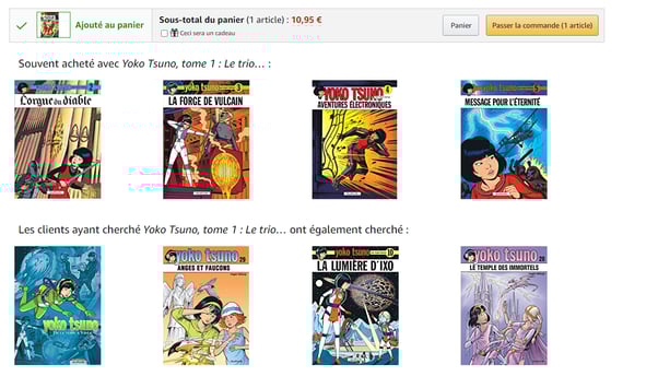 En cliquant sur ajouter au panier, Amazon redirige vers une page intermédiaire nous proposant des articles supplémentaires. La liste étant très liée à l’article ajouté, cette page reste une réussite même si elle amène un clic supplémentaire.