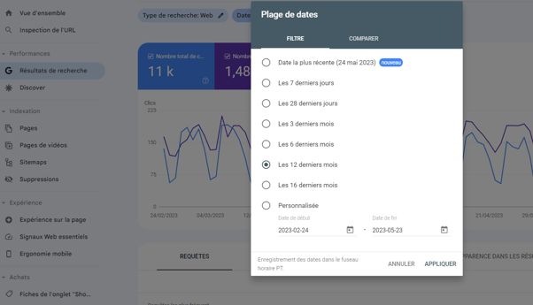 Par rapport à la création de contenu et à la définition de sujets pour votre blog, il existe quelques astuces facilement activables. Ici, on va chercher à identifier des mots clés sur lesquels votre site a imprimé (cela veut dire que google à choisi de vous faire apparaître dans la SERP lors de la recherche de l’internaute), mais qui n’ont jamais été vraiment travaillés, et qui enregistrent donc peu, voir aucun clic.