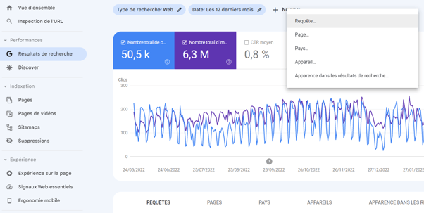 - Cliquez sur le “+” à côté du choix de la période d’analyse, et sélectionnez “Requêtes”