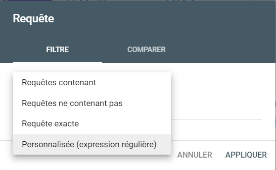 - Dans le champs “Saisir une expression régulière”, copiez-collez la formule suivante : (?i)^(qui|quoi|où|quand|pourquoi|comment|avec|et|pour).*